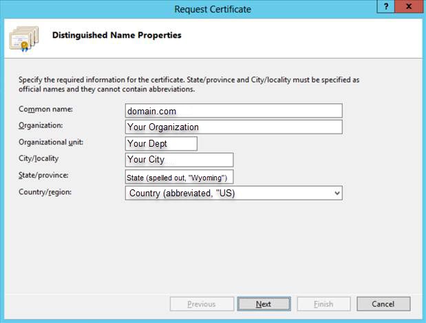 - In the Distinguished Name Properties window, enter in the required CSR details and then click Next.