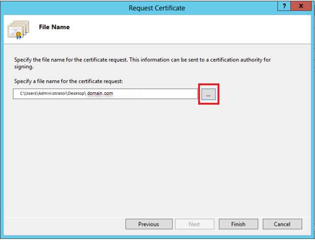 - Click Browse to specify the location where you want to save the CSR as a ".txt" file and click Finish.