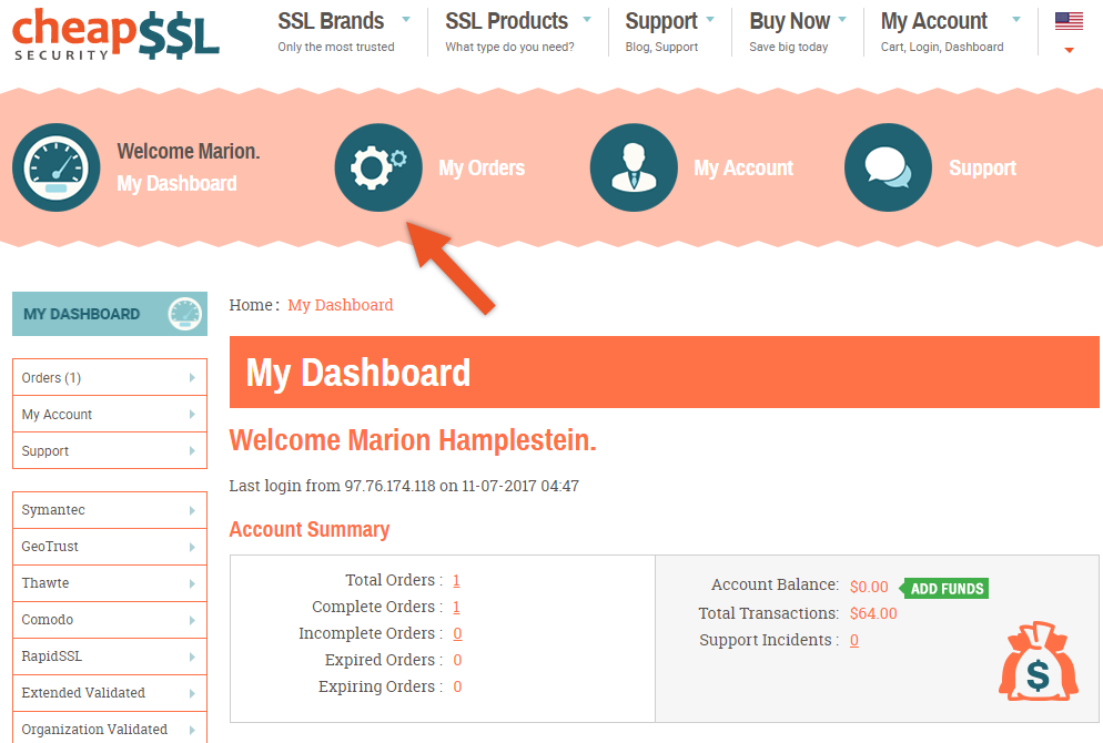 Locate the order for the certificate you would like to reissue, and click the hyperlinked order number